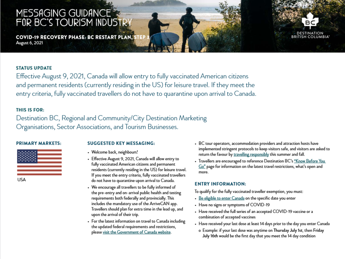 INDUSTRY MESSAGING GUIDANCE FOR U.S. VISITORS; Free Access to Accommodation Performance Tracking Data with STR; Grant & Program and Professional Development Opportunities; BC Government News and more.